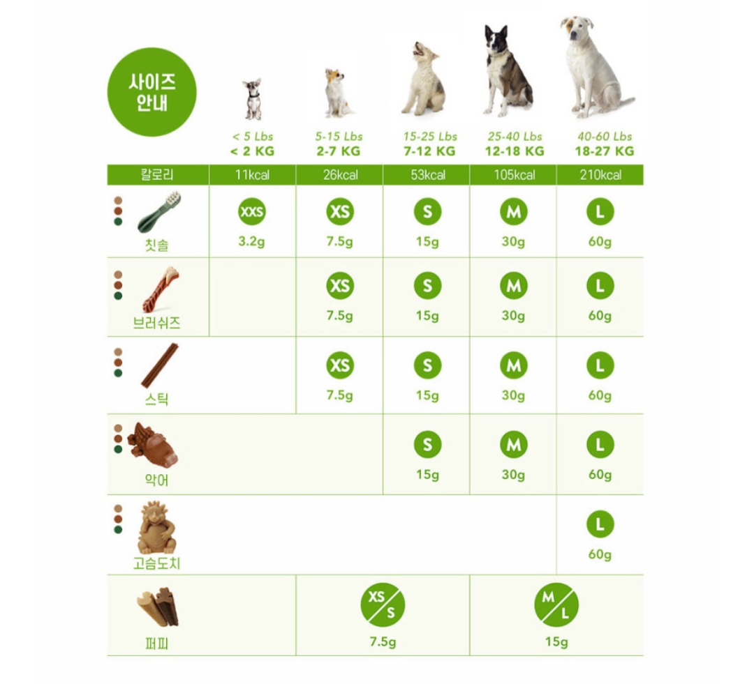 제가 구매한 제품은 칫솔, 스틱, 악어로 구성되어 있고 체중에 권장하는 사이즈는 위에 사이즈표 참고부탁드려요 🐶